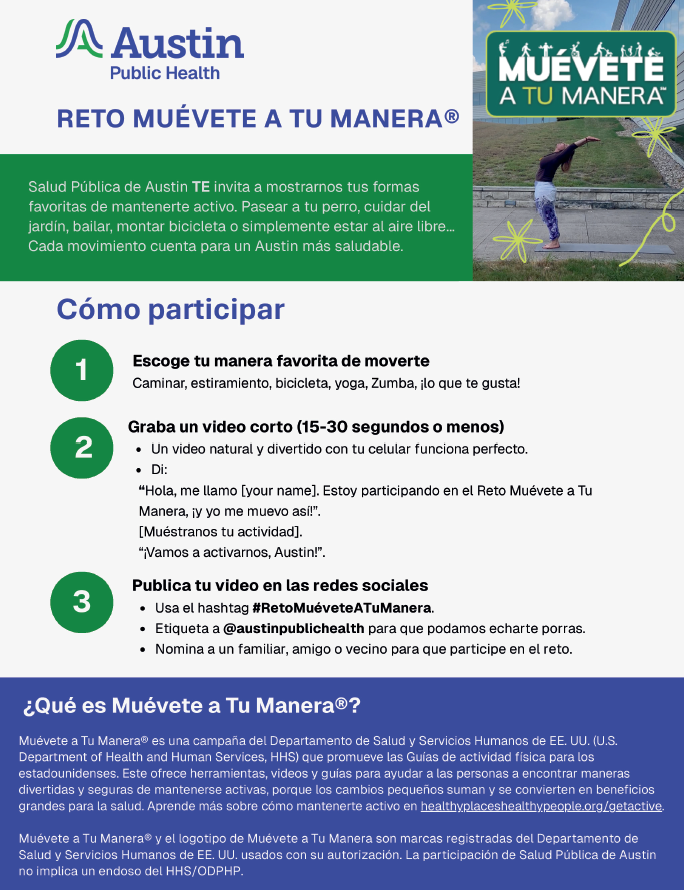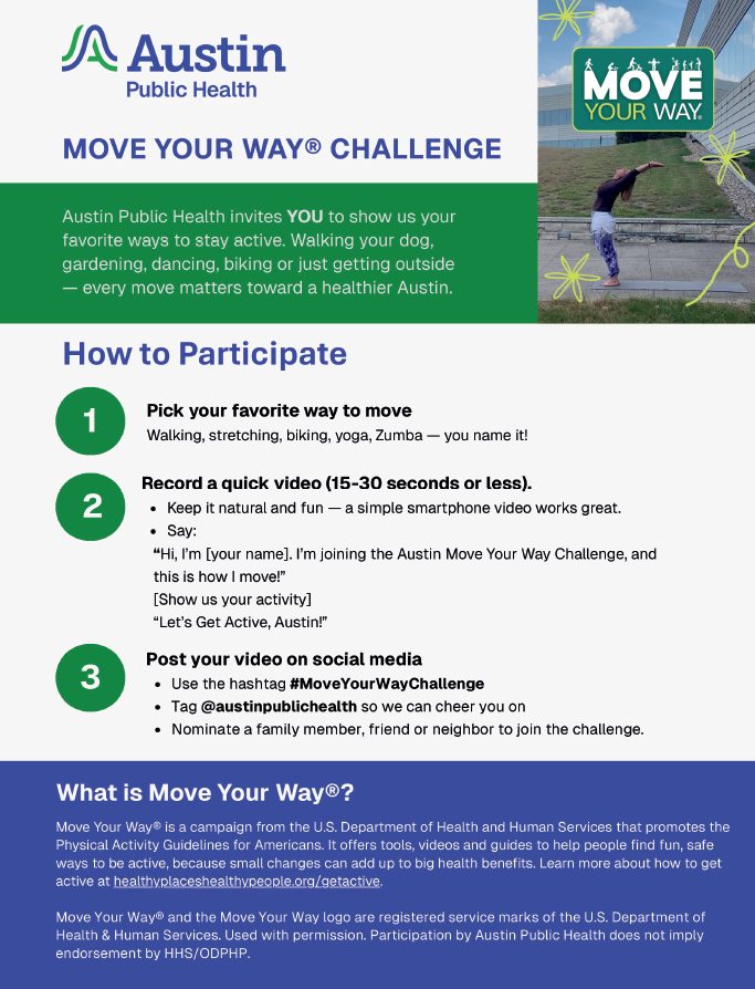 Move Your Way® and the Move Your Way logo are registered service marks of the U.S. Department of Health & Human Services. Used with permission. Participation by Austin Public Health does not imply endorsement by HHS/ODPHP